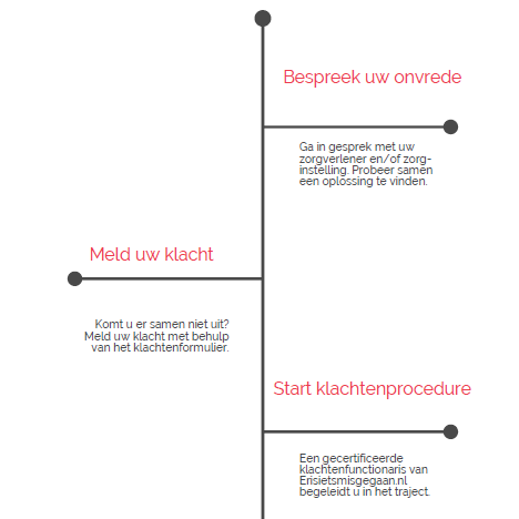 Stap 2: Klacht voorleggen aan onafhankelijke klachtenfunctionaris Komt u samen met uw behandelaar niet tot een passende oplossing, dan kunt contact opnemen met Erisietsmisgegaan.nl. Erisietsmisgegaan.nl is een externe organisatie waarbij we zijn aangesloten om onvrede of klachten over uw behandeling te helpen oplossen. Gebruik hiervoor het formulier melden onvrede bij erisietsmisgegaan.nl Na het indienen van dit formulier maakt een klachtenfunctionaris een telefonische afspraak met u op om uw melding en de behandeling daarvan te bespreken. In eerste instantie zal de klachtenfunctionaris bemiddelen tussen u en de zorgverlener met hoor en weder hoor. Uw melding wordt behandeld volgens de richtlijnen van de Wkkgz.